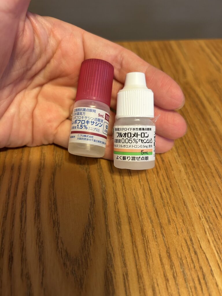 診断結果はアレルギー性のものか、結膜炎のどちらかでしょうとの事。どちらにせよ出してもらった点眼薬2種類が効いてくるでしょうと。
