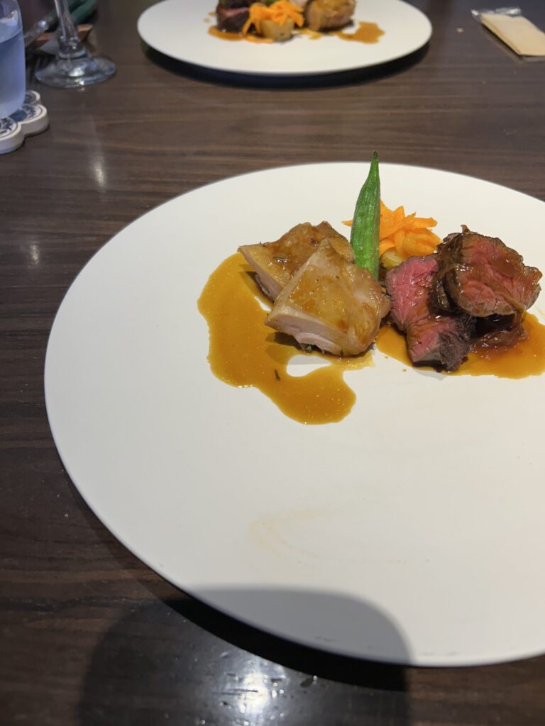 お肉料理2種のコースにしました。牛肉のフィレステーキと鶏肉のソテー(あとはミートローフも選べました)